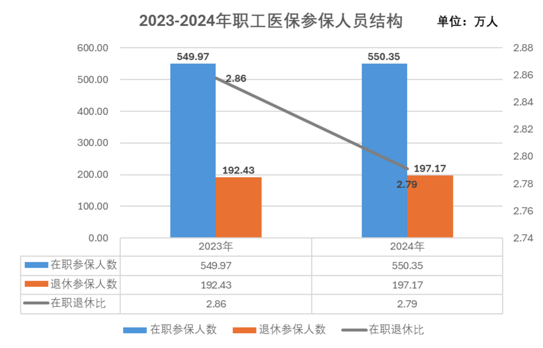 1.参保人数。截至2024年底,职工基本医疗保险(以下简称“职工医保”)参保747.53万人,比上年增加5.13万人,增长0.69%,其中在职职工550.35万人,退休职工197.17万人。