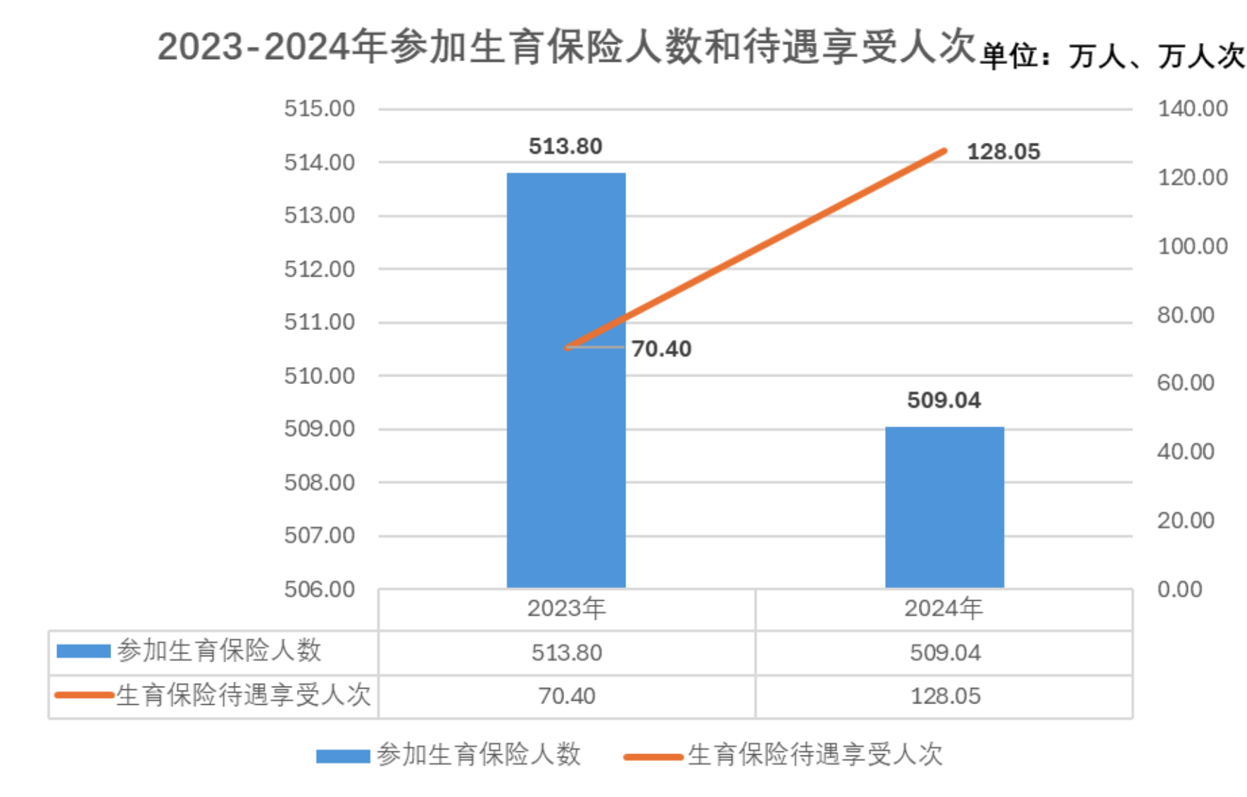 2024年全区参加生育保险509.04万人,比上年减少4.76万人,下降0.93%。享受各项生育保险待遇128.05万人次,比上年增长81.90%。生育保险基金支出27.21亿元,比上年增长57.83%。(2023年起生育保险待遇享受人次口径增加产前检查人次数)