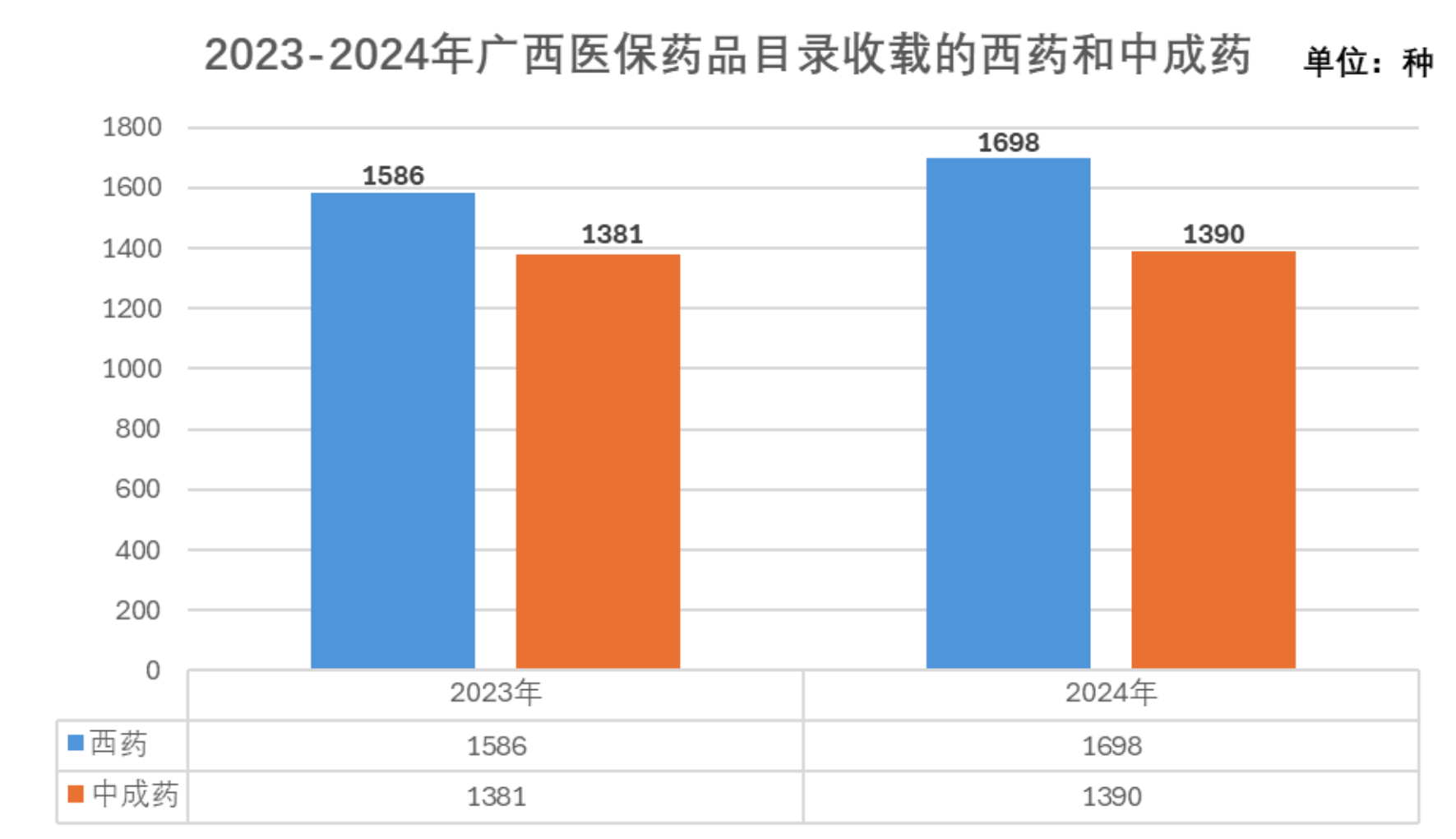 全区统一执行《国家基本医疗保险、工伤保险和生育保险药品目录(2023年)》,共收载西药和中成药共3088种,其中,西药1698种,中成药1390种。在国家医保药品目录的基础上,广西按规定将531种中药(含壮瑶药)饮片和246个医疗机构制剂纳入医保支付范围。